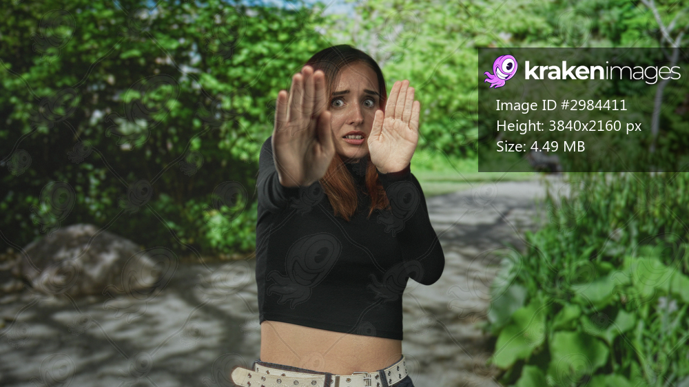 Woman redhead raises hands to block and cover her face on a forest path, palms out and body turned slightly; fear protection.