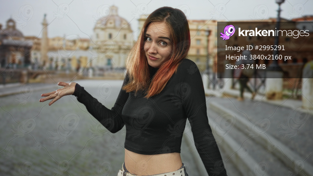 Woman redhead raises palm up gesture showing bare waist on cobblestone street by classical building; playful doubt.