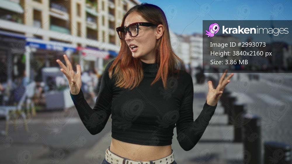 Woman redhead wearing black crop top with exposed midriff and glasses, gestures with hands and crosses arms on a city street; frustration disagreement. - Kraken Images
