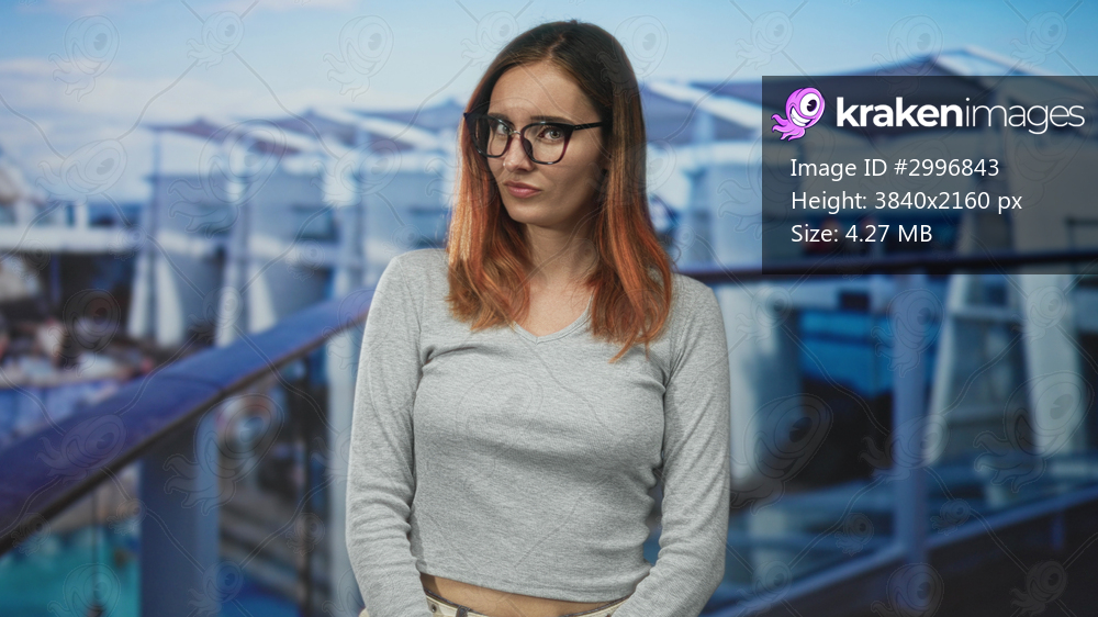 Woman redhead wearing glasses points index finger and furrows brow in studio against cruise ship backdrop; skepticism doubt scrutiny.