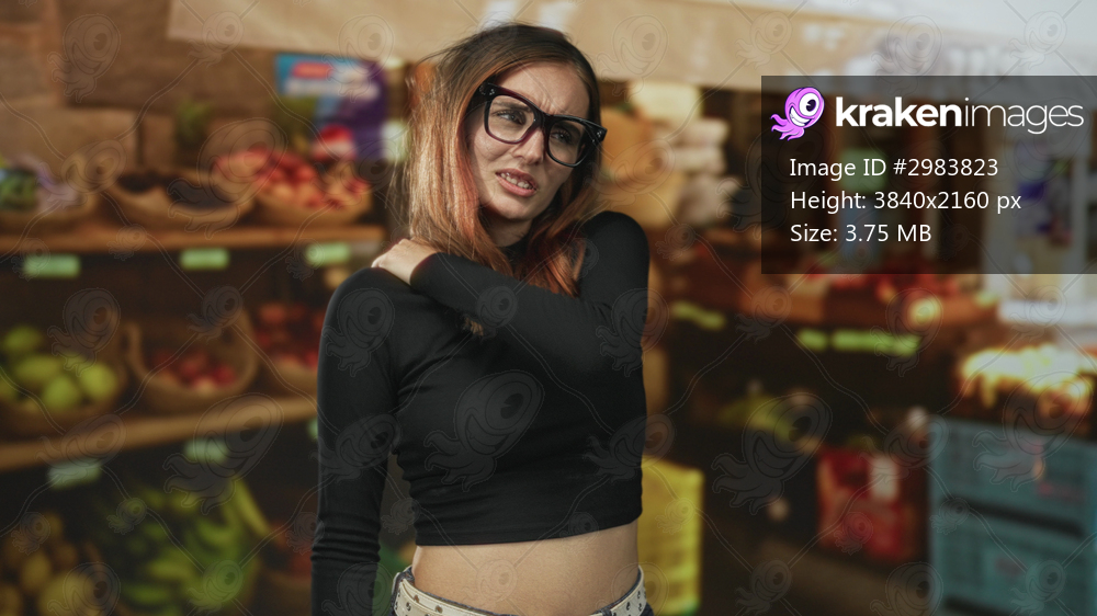 Woman redhead wearing large glasses and a black crop top rubbing her shoulder and wincing amid fruit stalls in a building; discomfort fatigue resilience. - Kraken Images