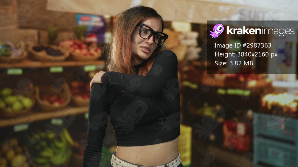 Woman redhead wearing large glasses and a black crop top rubbing her shoulder and wincing amid fruit stalls in a building; discomfort fatigue resilience. - Kraken Images