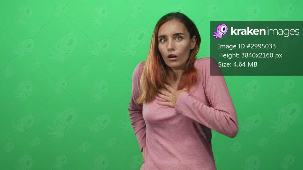 Woman redhead young gasping with hand on chest looking sideways wearing pink sweater in studio; anxiety breathlessness concern.