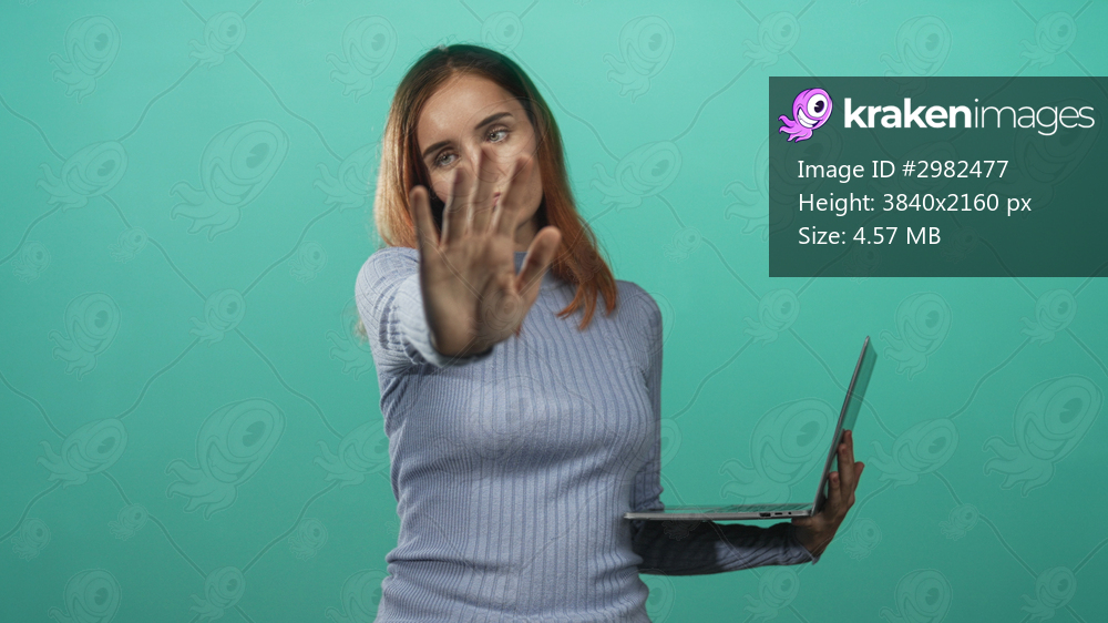 Woman redhead young holding laptop with palm forward stop gesture in studio wearing light sweater and looking serious; privacy boundary defiance.