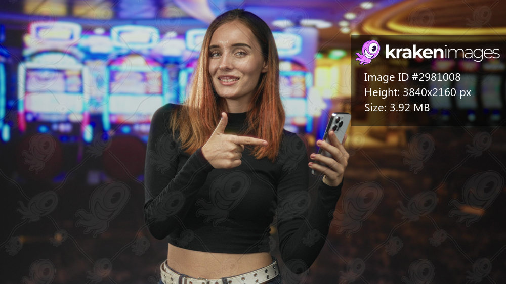 Woman redhead young holding smartphone and pointing at screen amid casino slot machines while smiling and gesturing with hand; playful luck.