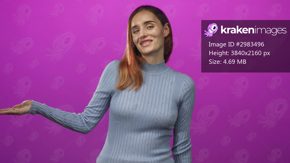 Woman redhead young wearing blue ribbed sweater extends right hand palm up with slight smile in studio with magenta backdrop; friendly invitation.