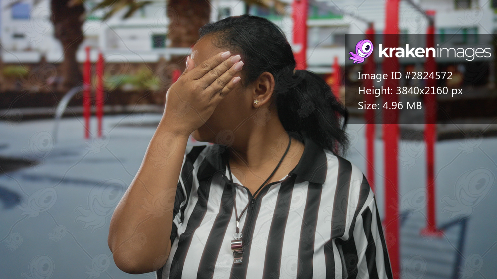 Woman referee holding a whistle holds up hand palm to signal stop in outdoor sports center playground; refusal.
