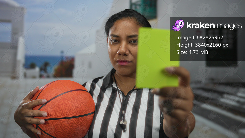 Woman referee holding basketball and showing yellow card while wearing whistle on street; fairness authority.