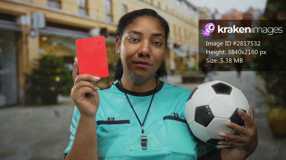 Woman referee holding red card and soccer ball on busy street in view of storefronts and lampposts; authority.