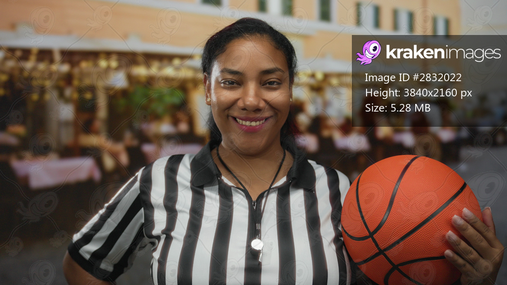 Woman referee holds basketball on outdoor restaurant terrace with whistle hanging from her neck; sportsmanship fairness duty confidence.