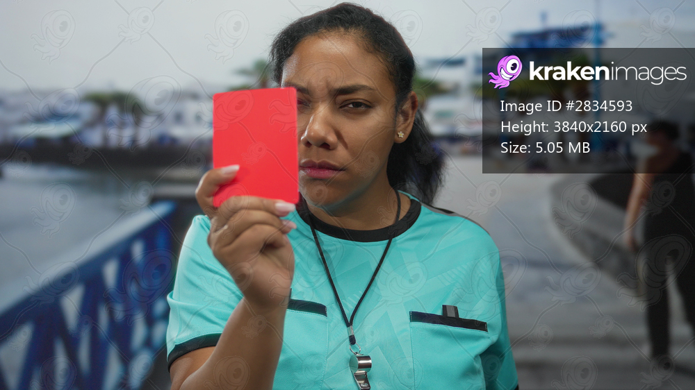 Woman referee on street by the sea holds red card at eye level with whistle visible; discipline decision.