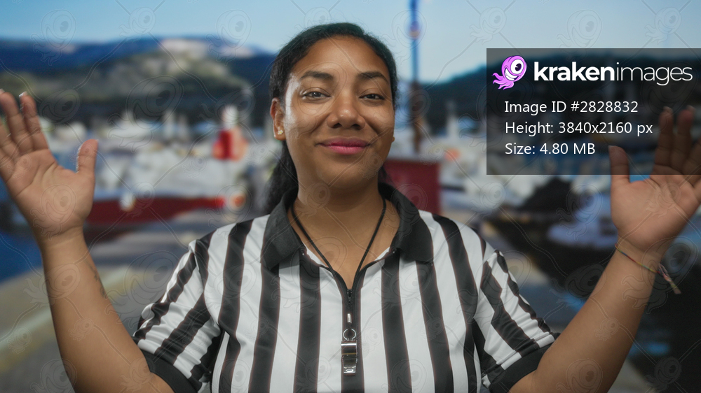 Woman referee raises both hands holding a whistle at a sunlit port dock by moored boats smiling with closed eyes; calm focus.