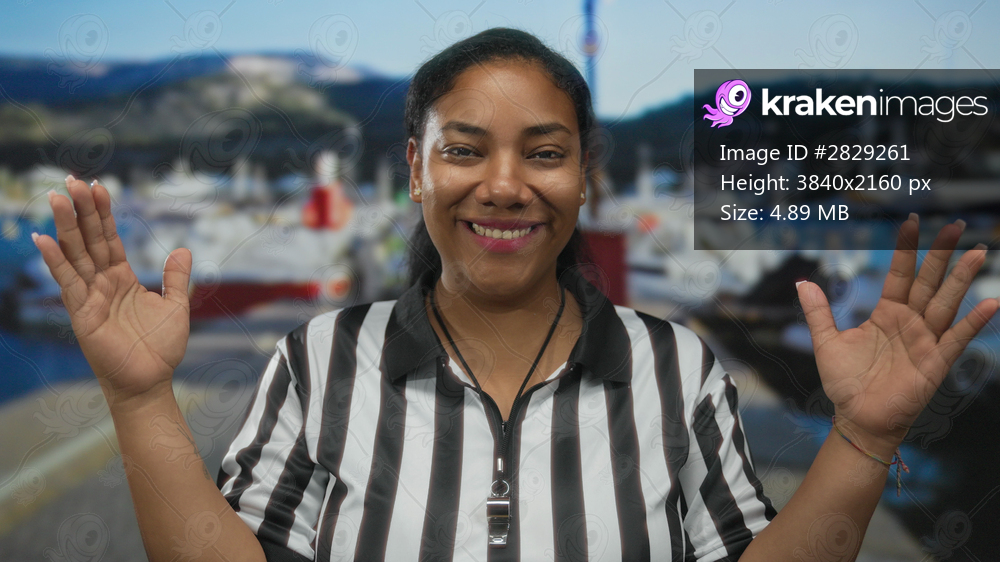 Woman referee raises both hands holding a whistle at a sunlit port dock by moored boats smiling with closed eyes; calm focus.