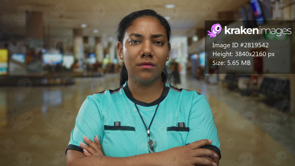 Woman referee stands with crossed arms and stern expression by baggage carousel in busy airport terminal; rejection authority vigilance resolve.