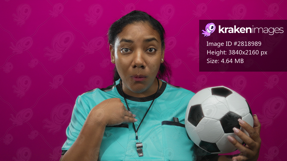 Woman referee wearing turquoise jersey pointing finger to chest and holding soccer ball in a pink studio; surprise.