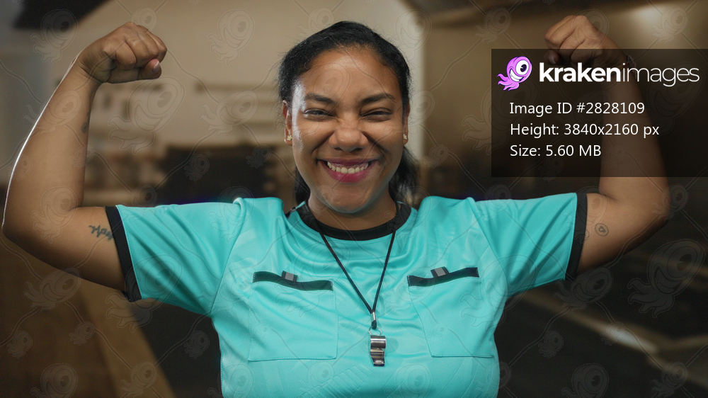Woman referee wearing turquoise shirt and whistle flexing arms in kitchen indoors; strength empowerment confidence.