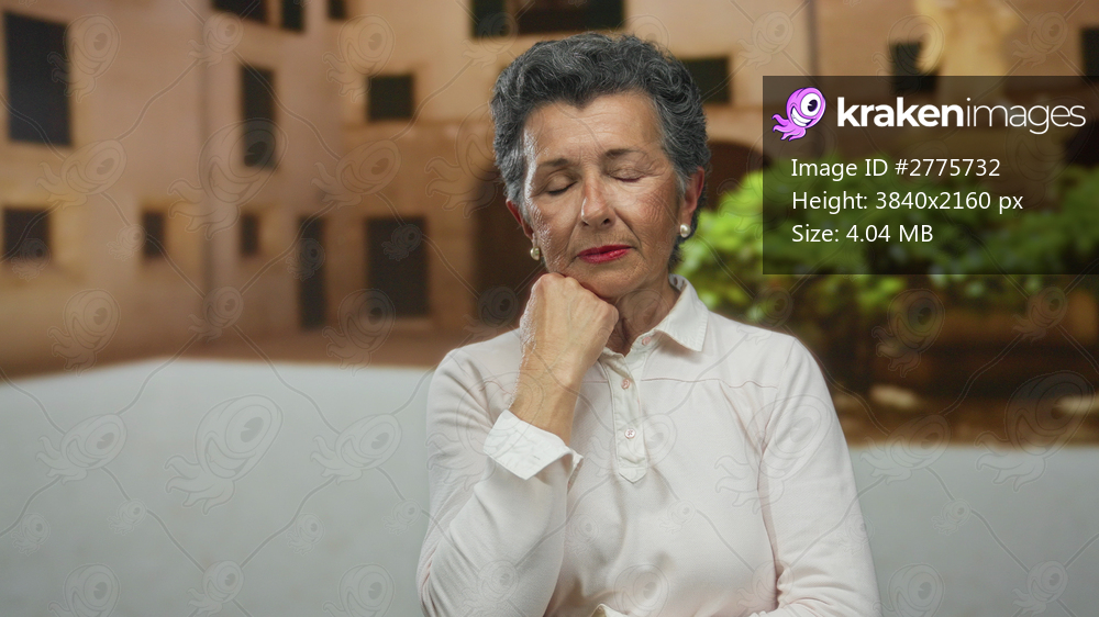 Woman reflecting with closed eyes in an old town street, highlighting serene grey-haired senior in urban outdoor setting.