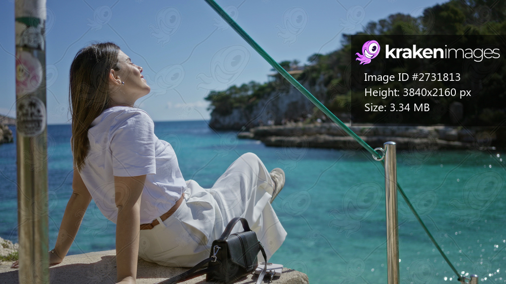 Woman relaxing at cala llombars in mallorca, enjoying the mediterranean landscape with turquoise waters and rocky cliffs on a sunny day, reflecting tranquility and serenity. - Kraken Images