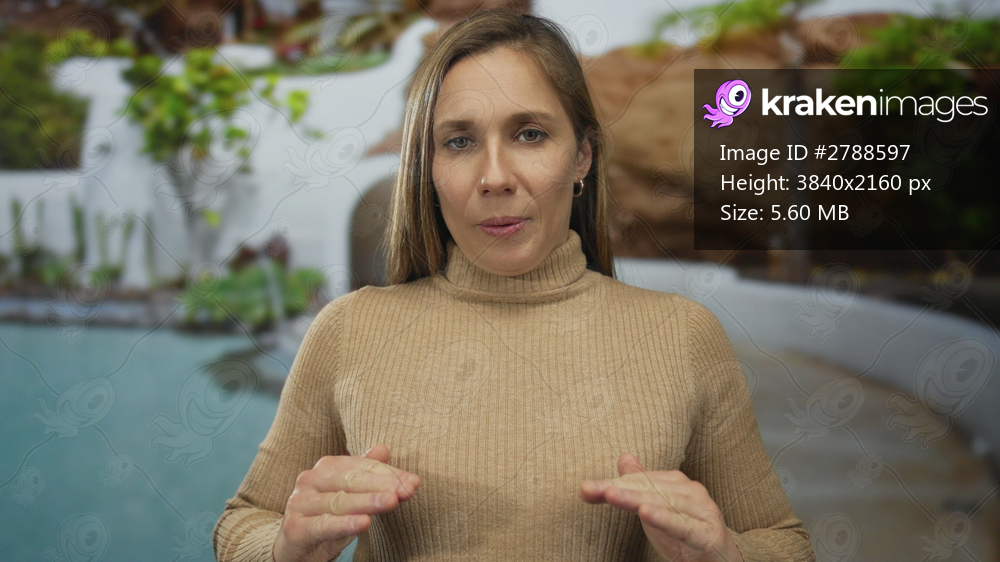 Woman relaxing by a resort pool with lush greenery and modern architecture background, expressing calmness and tranquility in a serene hotel environment outdoors. - Kraken Images