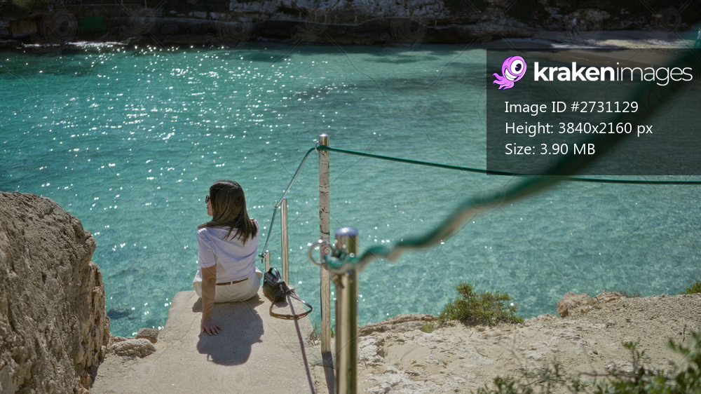 Woman relaxing by turquoise sea at cala llombards beach in mallorca, overlooking the stunning mediterranean scenery, enjoying serene vacation moments under bright sunlight.
