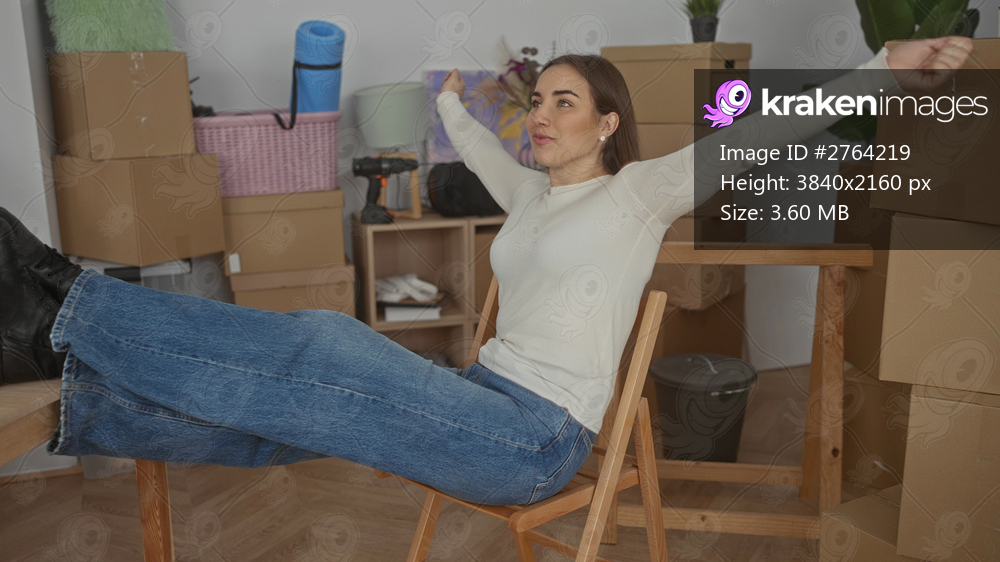Woman relaxing in a new home surrounded by packing boxes, plants, and furniture, showcasing the moving-in experience with a sense of relief and accomplishment. - Kraken Images