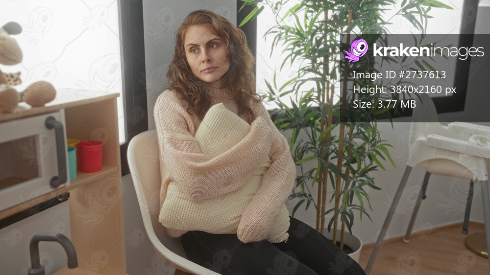 Woman relaxing in cozy living room hugging pillow with indoor plant nearby and toys on shelf, creating a warm, inviting home atmosphere.