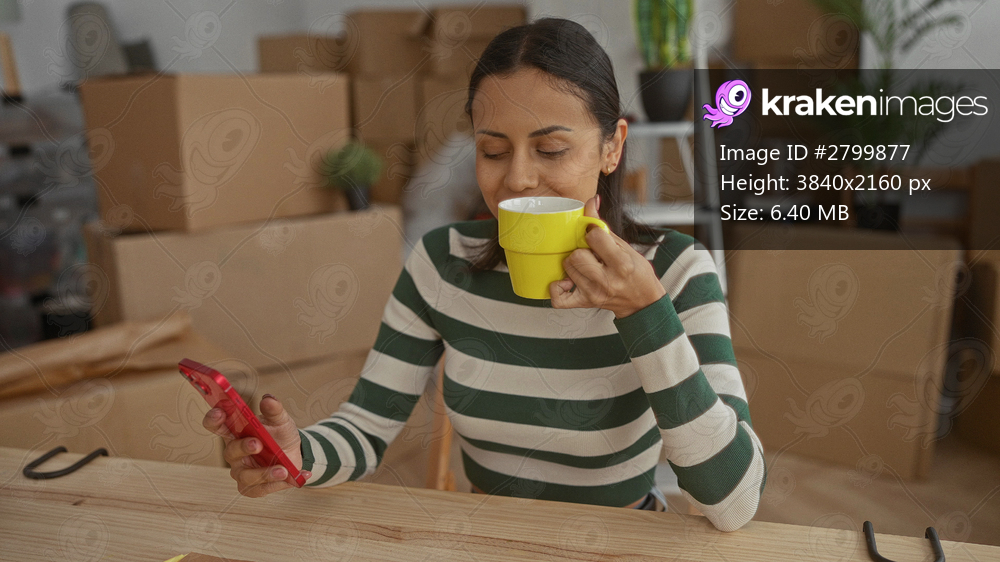 Woman relaxing in new home holding yellow mug and smartphone surrounded by moving boxes suggests fresh start indoors capturing a moment of tranquility happiness and comfort. - Kraken Images