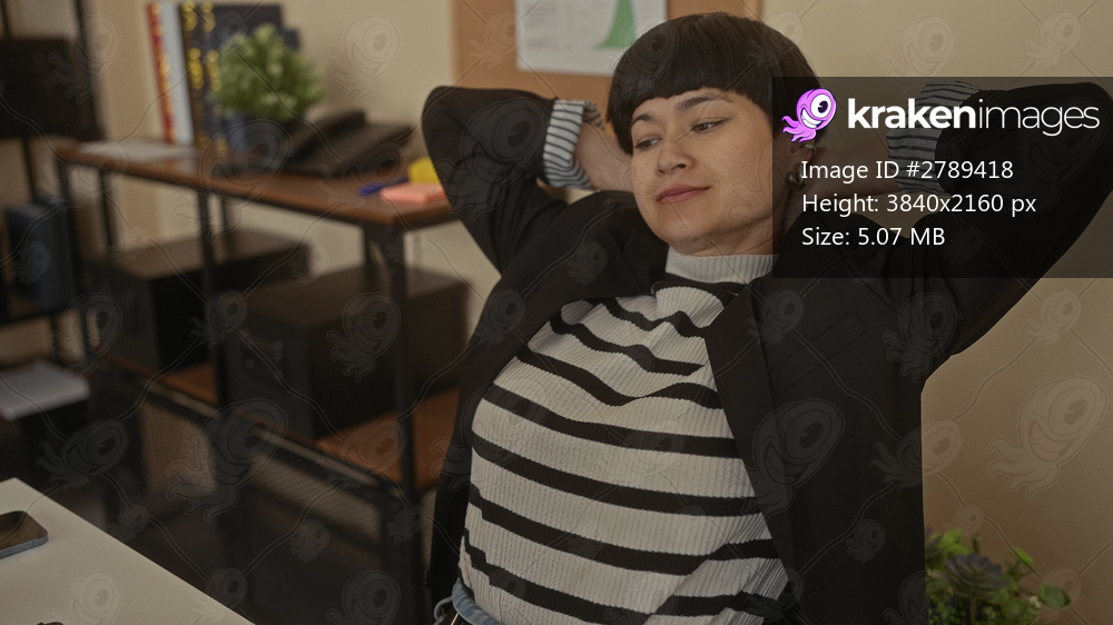 Woman relaxing in office workplace wearing casual outfit looking content surrounded by office supplies modern furniture and indoor plants in business setting. - Kraken Images
