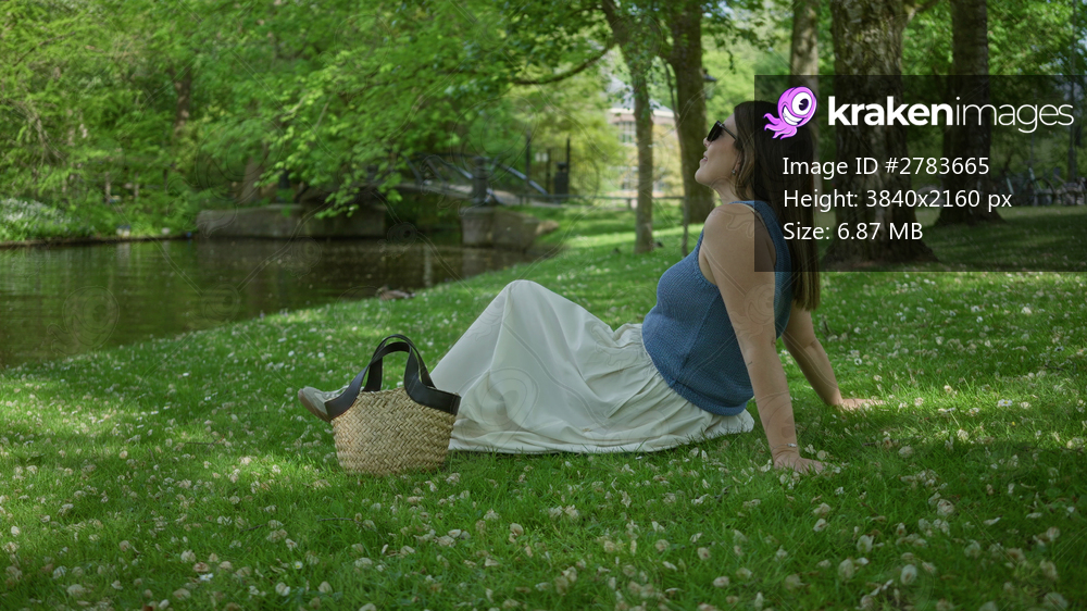 Woman relaxing on lush green grass in a serene garden wearing sunglasses with a woven handbag nearby under shaded trees by a serene pond in summer.