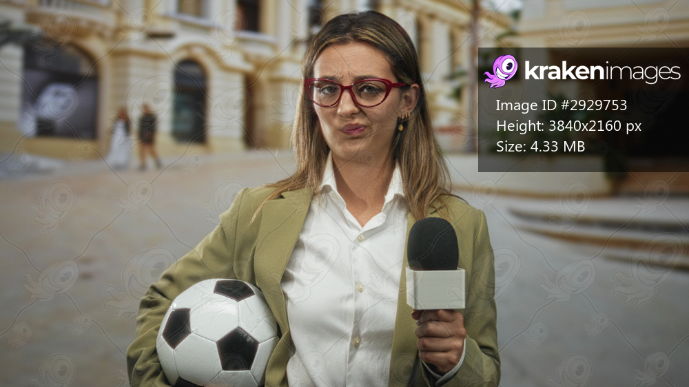 Woman reporter grimacing while holding microphone and soccer ball near building entrance and steps; annoyance.
