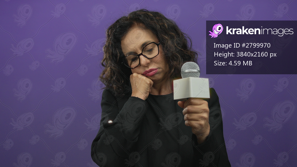 Woman reporter holding microphone against purple background, wearing glasses and black attire, suggests serious mood in isolated setting.