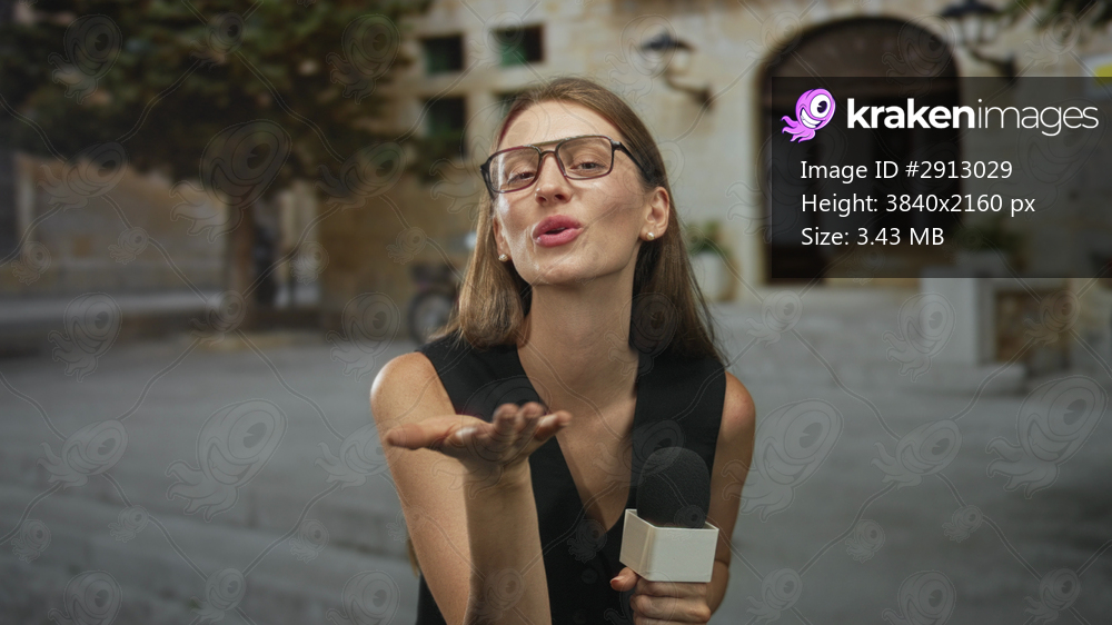 Woman reporter holding microphone and blowing kiss with hand in street in front of building; friendly connection.