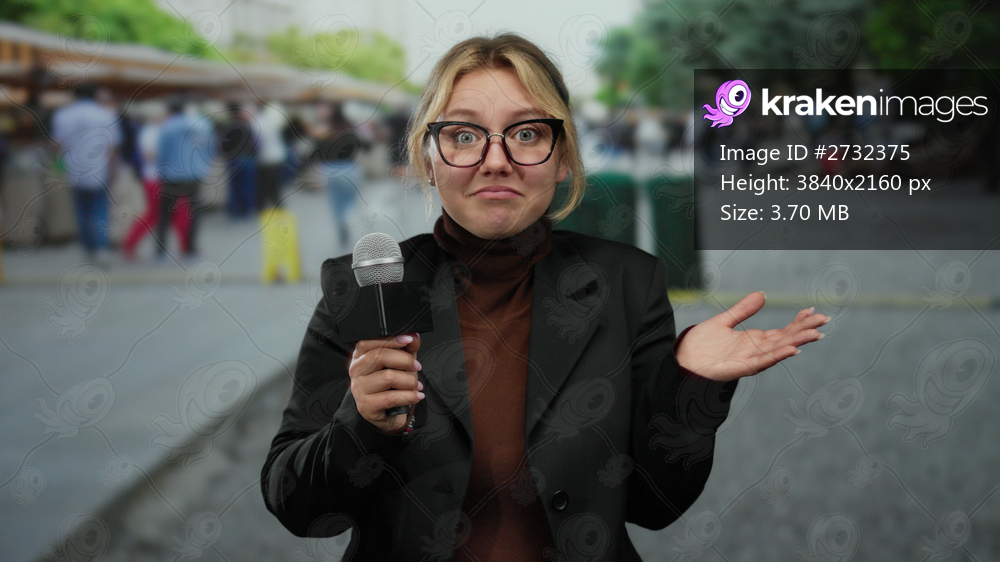 Woman reporter holding microphone in city street market, wearing glasses and black blazer, standing outdoors with shops and people in background.