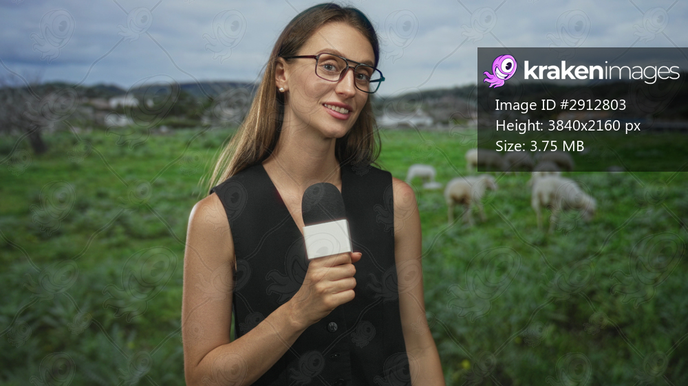 Woman reporter holding microphone in green field gesturing with hand smiling and speaking to camera; rural news calm.