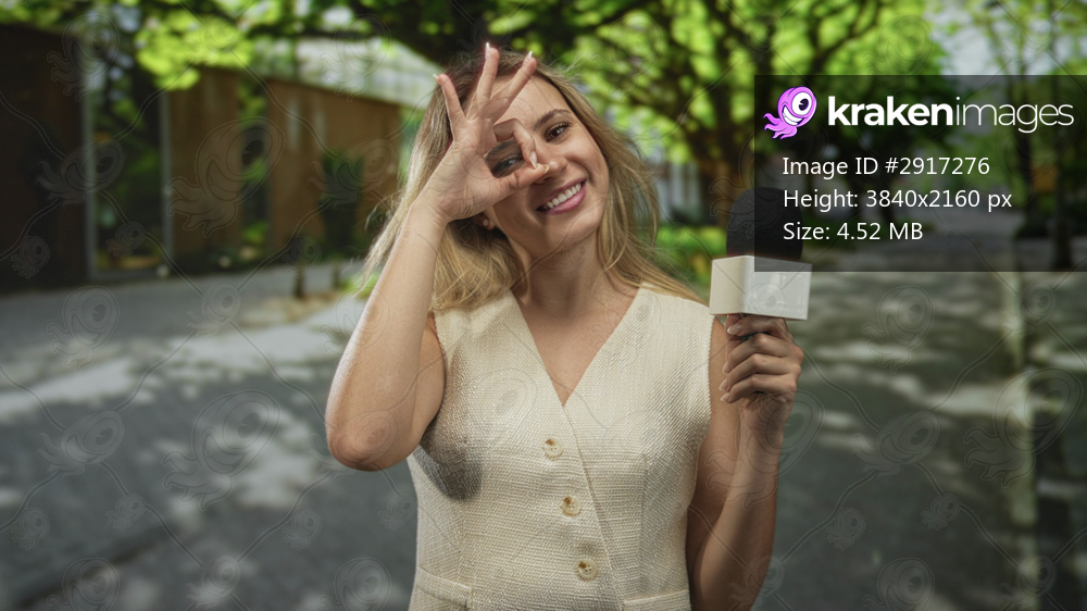 Woman reporter holding microphone makes ok sign with hand over eye on a street; playful interview moment.
