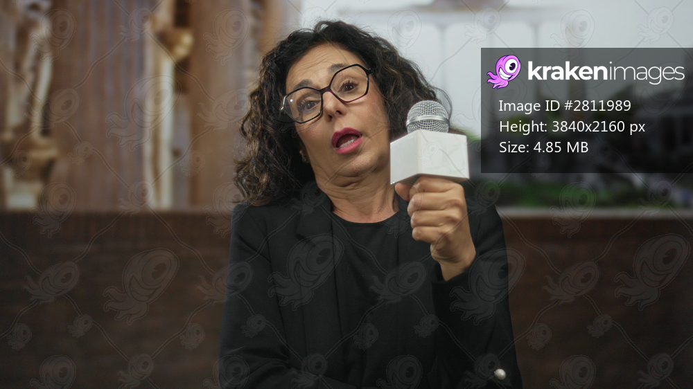 Woman reporter holding microphone on ancient street backdrop in old town emphasizes middle-aged hispanic presence outdoors capturing storytelling essence. - Kraken Images