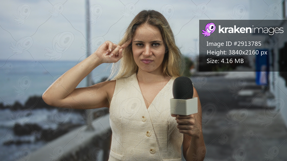 Woman reporter holding microphone on seaside promenade street pier, touching ear with one hand and frowning skeptically at scene; skepticism.