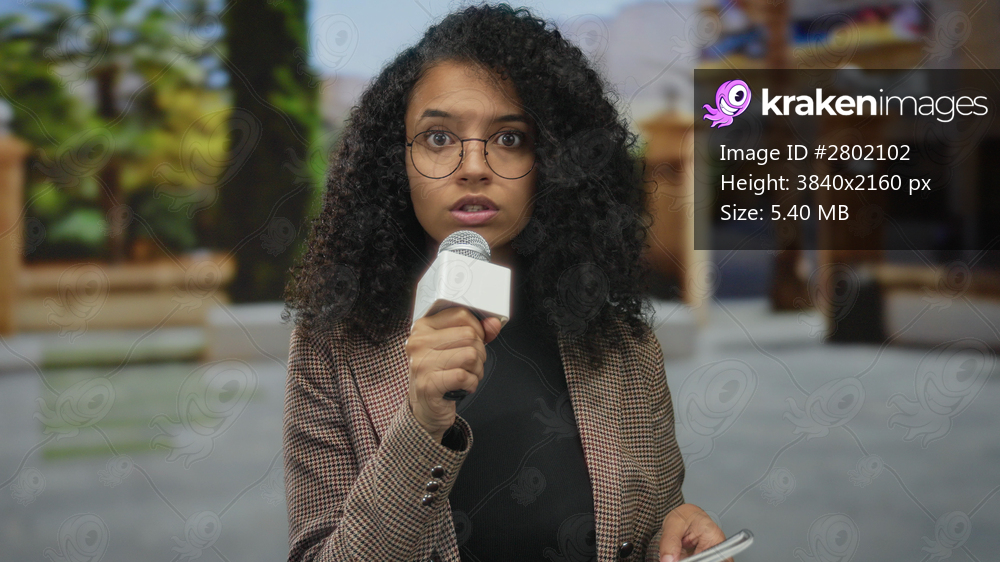 Woman reporter holding microphone on street conducting outdoor interview with notepad in hand wearing glasses curly hair and brown jacket.