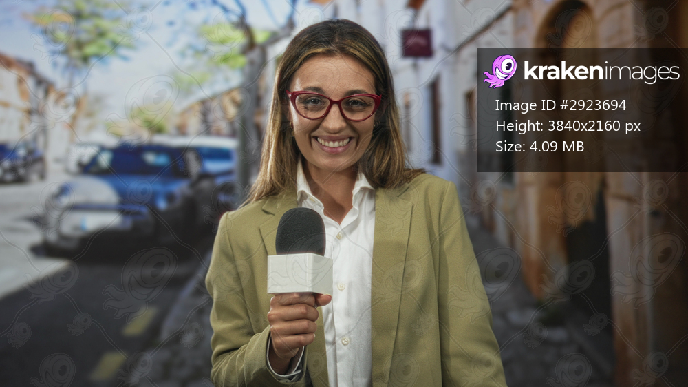 Woman reporter holding microphone on street, smiling to camera while wearing blazer and red glasses; urban reporting confidence.