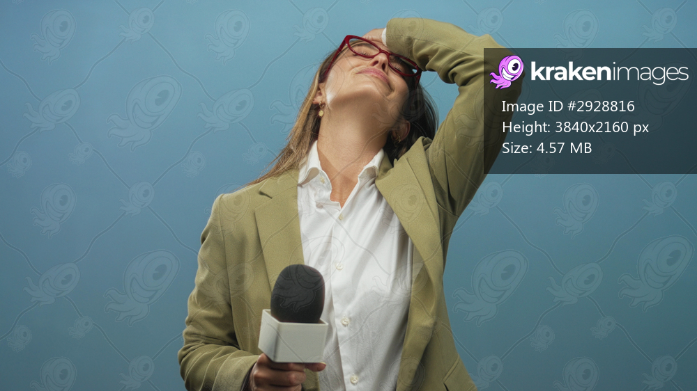 Woman reporter holding microphone, palm to forehead and closed eyes in studio with blue wall; frustration live report.