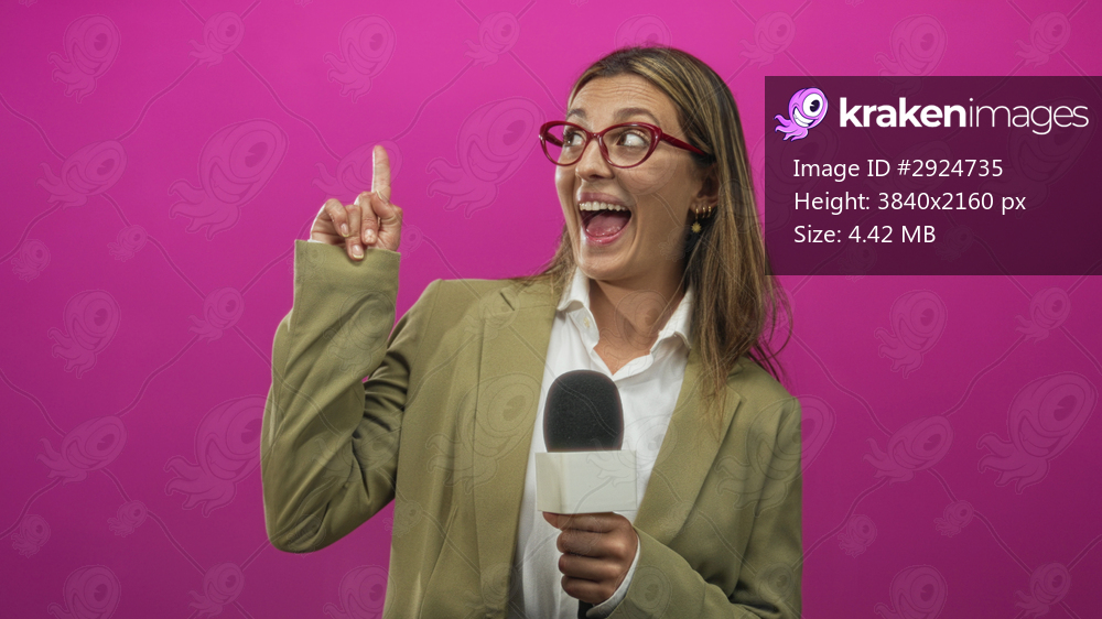 Woman reporter holding microphone points finger and laughs broadly in pink studio while wearing olive blazer; enthusiasm.