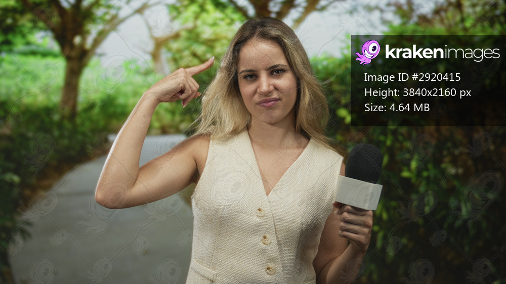 Woman reporter holding microphone points finger to head on park walkway in forest setting; skepticism thinking.