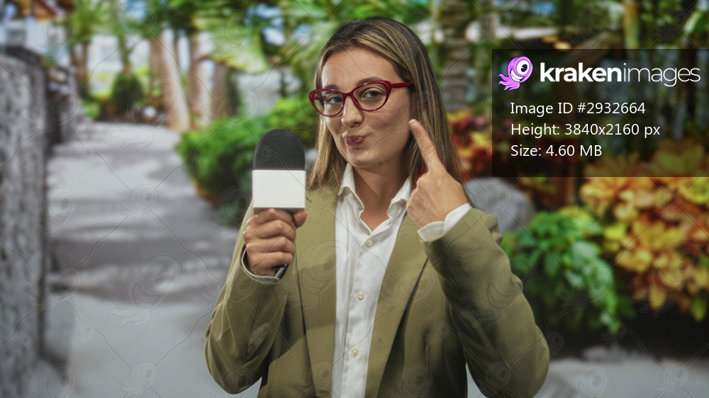Woman reporter holding microphone points index finger toward camera in forest park with green foliage and pathway; playful call.