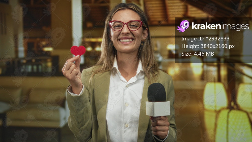 Woman reporter holding microphone and small red heart between fingers in building lobby; warmth love connection.