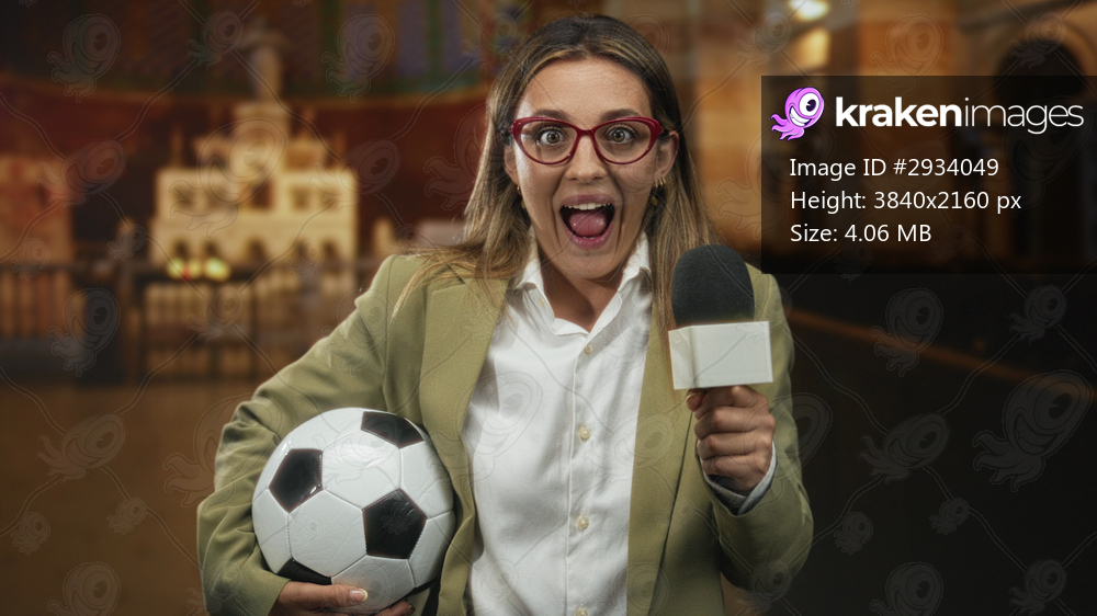 Woman reporter holding microphone and soccer ball in building, mouth open and speaking toward camera with excited pose; surprise celebration.