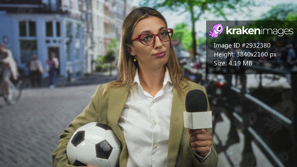 Woman reporter holding microphone and soccer ball on a city street, raised eyebrow gesture; media skepticism.