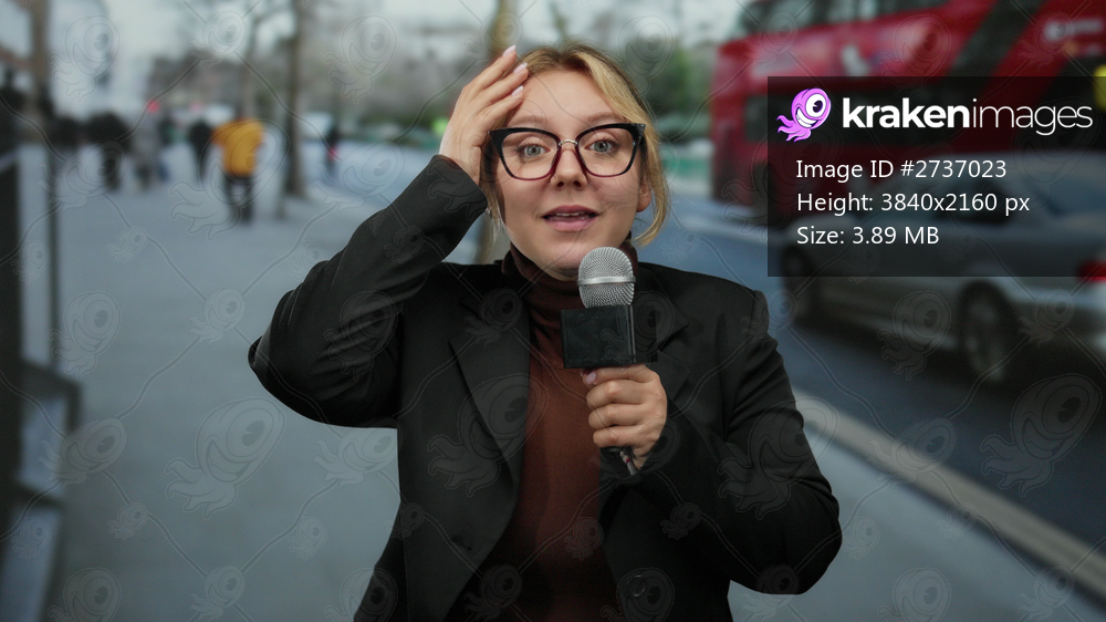 Woman reporter holding microphone with surprised expression on a city street with blurred traffic and pedestrians in the background during an outdoor report. - Kraken Images