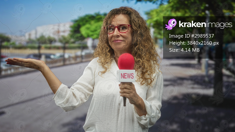 Woman reporter holding news microphone with red foam, palm out gesture on a sunny street; confident reporting.