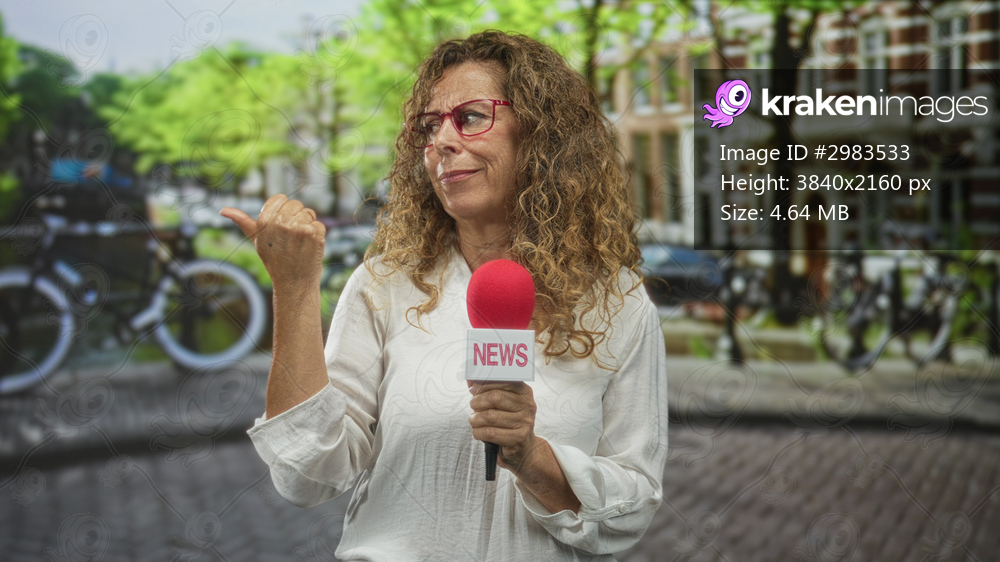 Woman reporter holding red microphone and wearing red glasses points thumb over shoulder on a cobblestone street by a canal with bicycles and brick buildings; amused commentary. - Kraken Images