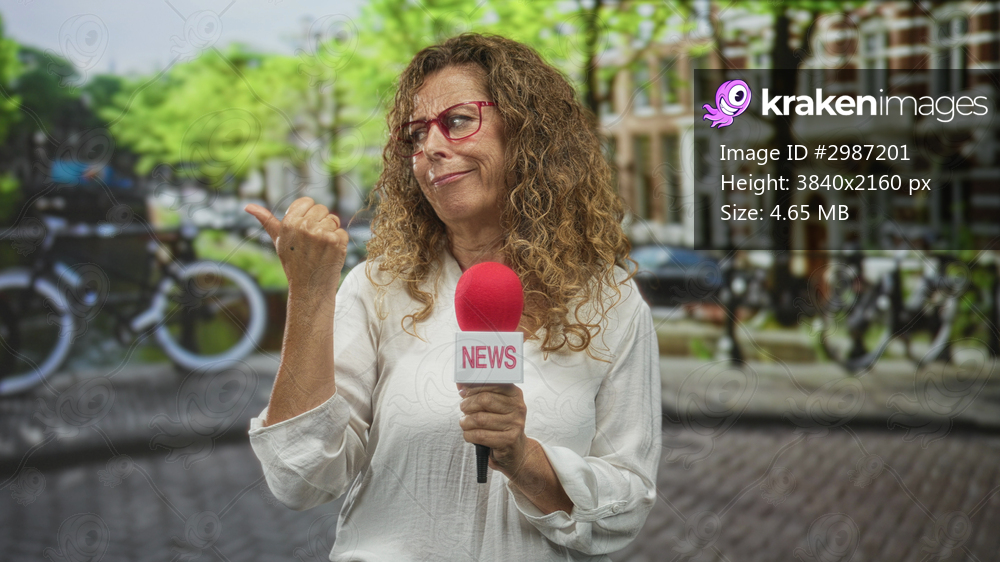 Woman reporter holding red microphone and wearing red glasses points thumb over shoulder on a cobblestone street by a canal with bicycles and brick buildings; amused commentary. - Kraken Images